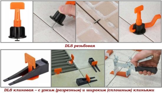 Оба вида устройства состоят из зажимов многоразового действия и расходных вертикальных стержней, наружная часть которых обламывается при демонтаже DLS, а внутренняя остаётся в шве. DLS позволяют укладывать плитку на пол и стены, увеличивая производительность даже при невысокой квалификации мастера, поэтому быстро стали популярны среди домашних мастеров. Со временем различные модификации таких устройств, различающиеся конструктивно — видом резьбового зажима, профилем одноразовых стержней, размером клиньев, стали выпускать и другие производители, в том числе российские.