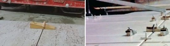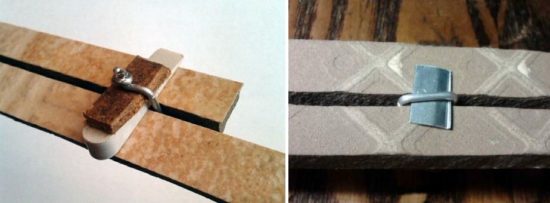 Если ни навыков в укладке кафеля, ни ДЛС промышленного изготовления нет, а результат хочется получить повыше, подобие выравнивающих зажимов можно изготовить своими руками. Сначала необходимо изготовить основания зажимов, которые будут располагаться под плиткой и останутся там после укладки. Для этого берут гвозди длиной 30-50 мм, откусывают у них шляпки и нарезают на куски по 1,5-2 см. Можно использовать и полоски листовой стали толщиной 0,5-0,8 мм. Древесина для этой цели не годится – она разбухнет от влаги и может вытолкнуть плитку. Затем из алюминиевой проволоки изготовляют подобие зажимов – хомуты, и делают на них насечки кусачками, как на фото, чтобы при удалении клиньев проволока порвалась в нужном месте. Размер хомутов выполняется в зависимости от толщины плитки и формы оснований зажимов.