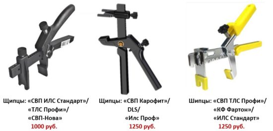 Если исполнитель не занимается укладкой плитки профессионально, приобретать СВП с зажимами под щипцы не рационально. С другой стороны, с крупноформатной плиткой лучше использовать именно такие системы.Стоимость некоторых универсальных моделей щипцов в Москве: