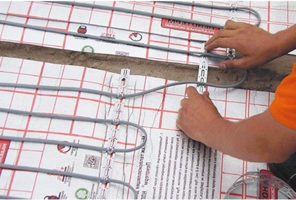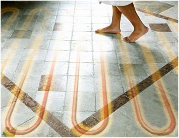 Нагревательный контур такого «тёплого» пола выполнен из изолированного кабеля малого диаметра, проложенного в бетонной стяжке актуальных зон помещения поверх утеплителя (желательно – фольгированного), минуя места установки мебели. Концы провода через датчик температуры и терморегулятор соединяются с бытовой электросетью – по отдельной линии с индивидуальным автоматом.