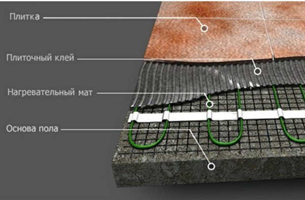 ТЭНовые маты из-за отсутствия необходимости сооружения толстой стяжки называют ещё тонкими кабельными полами – плиточный клей при укладке нагревательного контура заполняет ячейки сетки и создаёт прочное армированное основание.