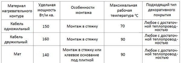 Для удобства сравнения основные характеристики пригодных к укладке под плитку электрических «тёплых» полов сведены в таблицу.