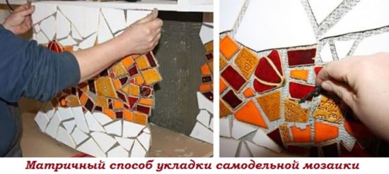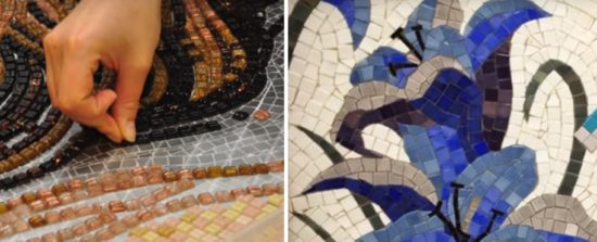 Важным достоинством мозаичной отделки является малый ущерб от порчи материала в процессе укладки, так как чипы мелкие, и ошибка с подгонкой нескольких элементов не существенна – их замена не потребует затрат. Это и привлекательно для начинающих мозаичников, не говоря уже о том, что самодельный мозаичный материал может вообще ничего не стоить.