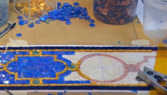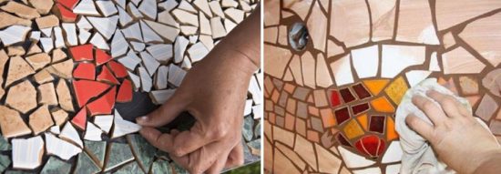 Уложенной мозаике дают пару дней на отверждение плиточного клея, после чего на покрытии выполняют затирку швов. Для заполнения стыков используют те же составы, что и при обустройстве кафельных швов – чаще всего на основе белого цемента.