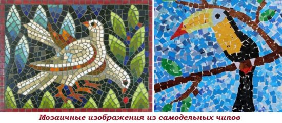Форму и размеры чипов, изготовленных самостоятельно, подбирают с привязкой к выполняемому рисунку – они должны быть соразмерны изображению и пригодны к выкладке линий нужной кривизны. Для создания основного фона можно использовать более крупные элементы, кривые же линии для снижения угловатости выкладываются из мелких деталей.