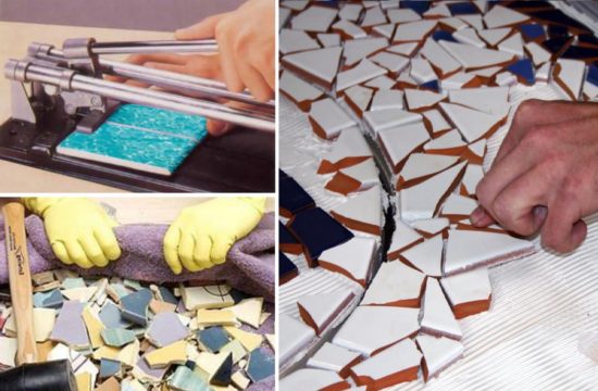 Определившись с рисунком, нужно запастись материалами, из которых будут изготавливаться чипы необходимых цветов. Под мозаику проще всего использовать кафель однотонных расцветок, вид керамики при этом не имеет значения. Обычно для этого ищут по магазинам дешёвые невостребованные остатки керамики, подойдут и оставшиеся после ремонта обрезки плитки.
